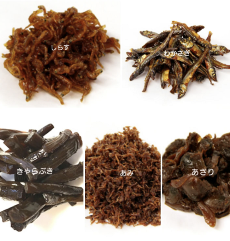 ①つくだ煮(あさり、あみ、しらす、わかさぎ、きゃらぶき)