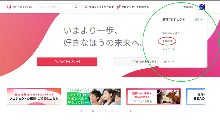 ③緑で囲った画面が開くので、その中の「支援履歴」をポチ