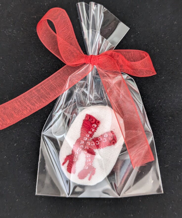 ブローチは、3cm×2cmほどの小さい盤面に、一つひとつ刺繍がほどこされ、ビーズも一つひとつ丁寧に……。2025が決まったときに、「私もがんばらなきゃ!」と言って、作り始めてくださった物です。まさかの100個いただいております。