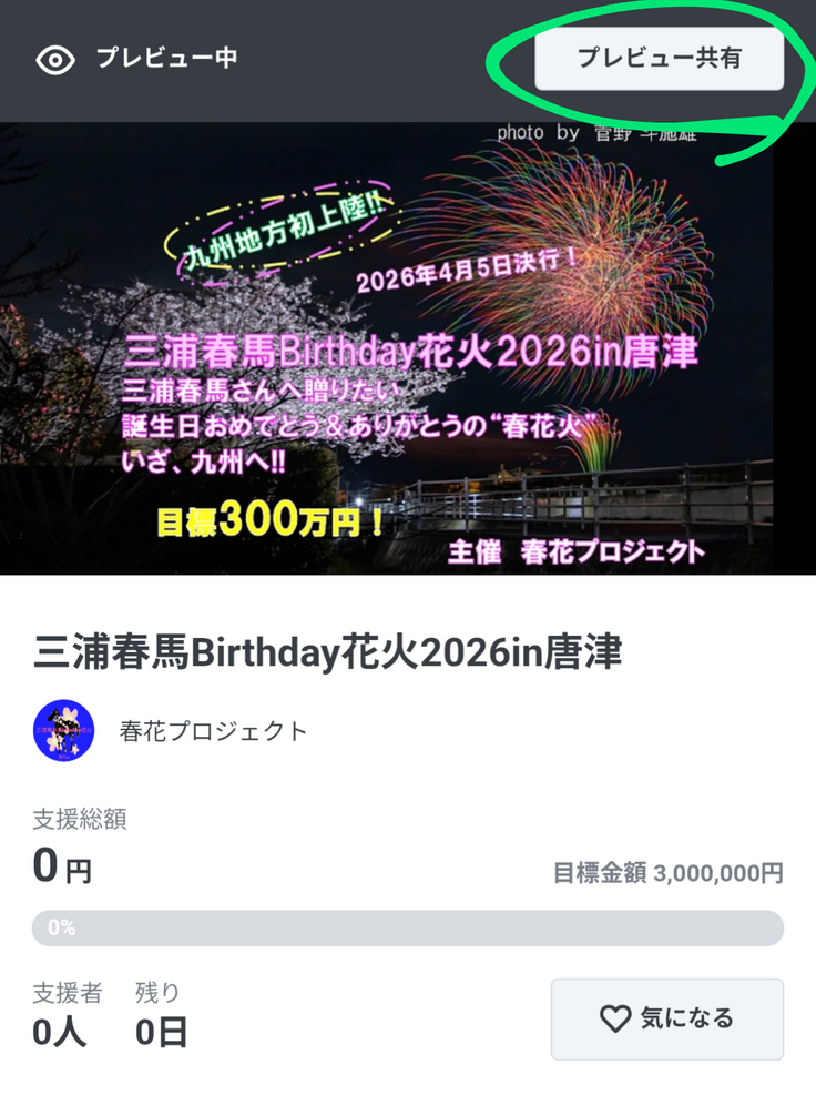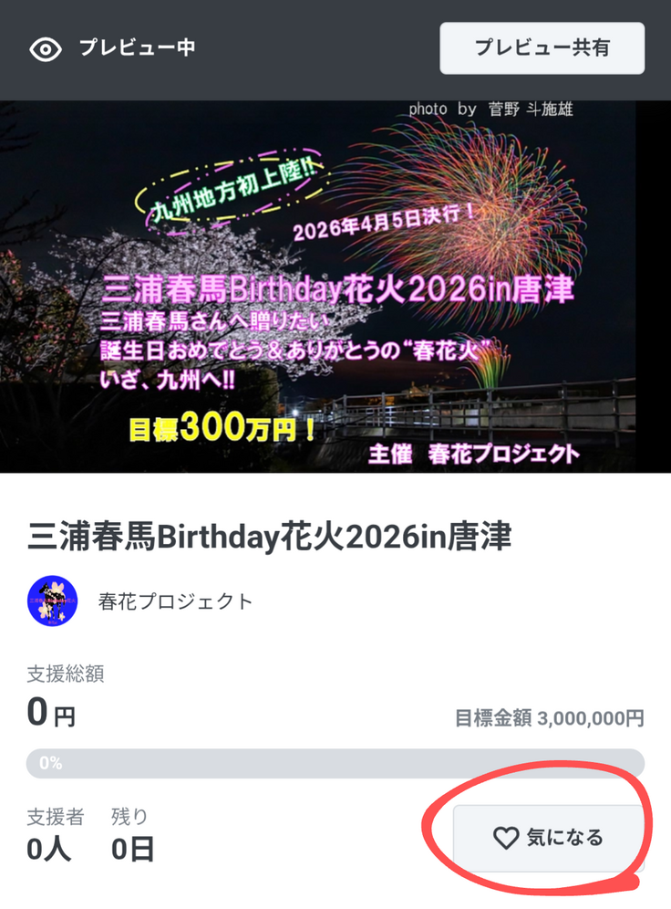 三浦春馬Birthday花火2026。とうとう走り出しました!目下の目標は、クラウドファンディング公開までに「気になる」の100ポチ獲得!クラウドファンディングは、正直何回やっても苦しいです。「がんばれ!」代わりに「気になる」をポチしていただけると、ひとりじゃないんだな。繋がっているんだなと元気も勇気も100倍になります。相変わらず世話のやける春花プロジェクトですが、がんばれのポチ、よろしくお願いいたします!
