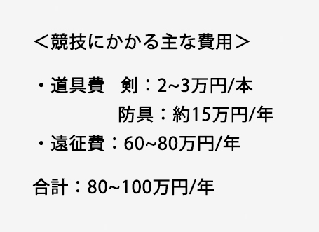 防具も全て揃えると約15万円もかかり、メタルジャケットといわれる有効面を突いた事を判定するための防具は4万円ほどの価格で汗をかくなどして劣化し、練習量が多いと一年ももたず、使用できなくなります。
