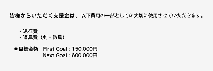 よって、このプロジェクトでは、遠征費、道具費(剣・防具)の費用の一部にするためのご支援をお願いいたします。