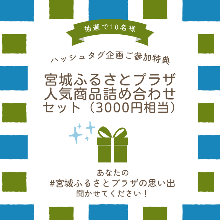ハッシュタグ企画にご参加いただいた方の中から抽選で、10名の方に「宮城ふるさとプラザの人気商品詰め合わせセット(3,000円相当)」をお送りします。(中身はお楽しみに!)