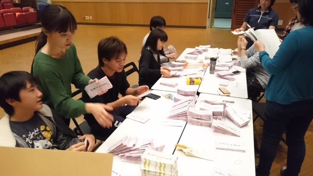 劇練習の合い間に、みんなでチケットの作成をしています。