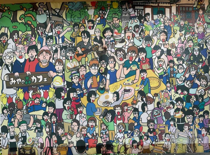クラウドファンディング、あと20日となりました。これを立ち上げるまでの道のりは、すべて初体験。リターン品は、カフェのクッキーはもちろん、カナメ君のドリップコーヒー、そして、なっちゃんのさをり織りのコースター・・・そして、ふっと「ほしい!」と心に降りてきたのが、わじまかんた君のみやの森オリジナルグッズ。母である満貴子さんに連絡したところ二つ返事でOKをもらえました。かんた君は何度か妹のかえでちゃんとカフェや里山遊び、運動教室に来てくれていました。まずは、シェアハウスに来てもらって空気を感じてもらうからスタート・・・と思っていましたが、かんた君はシェアハウスの座敷に座ったとたんすらすらと絵を描き始めていました。数枚の写真を見てみやの森カフェのめっちゃ楽しい集合絵が完成!これだけでも私たちは大感動!大きな宝物をもらいました。写真は、カフェにかけてあるタペストリーです!素敵でしょう✨