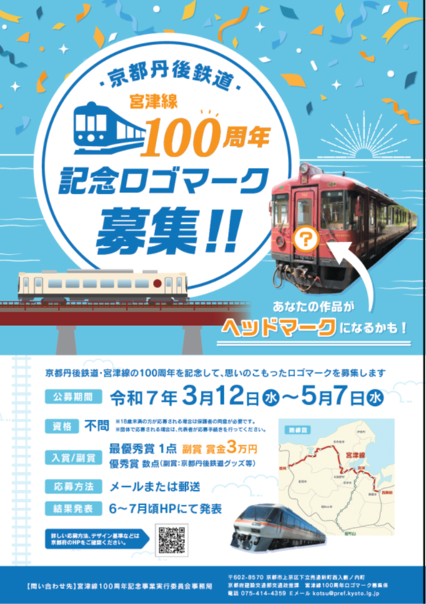 2024年から2032年にかけて、地域の皆さんとともに「宮津線100周年」を盛り上げていくため、記念ロゴマークを公募されますのでお知らせします。