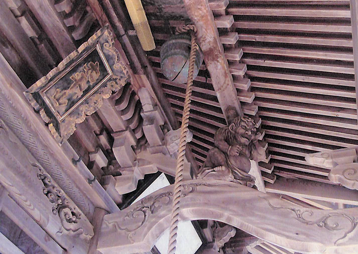鯱(しゃちほこ)を有する屋根瓦、神社の造り(扇垂木、軒支輪・尾垂木)や鮮やかな絵天井にも当時の職人の腕の冴えが随所に見受けられ、頭貫、向拝部分にはの名工後藤重太郎定融の作である龍、獅子、獏、力士像が彫刻されています。