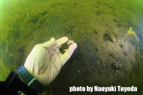 今日の写真は、昨年の9月に相模川の最源流である富士山麓の山中湖を潜水調査した際に撮ったものです。分厚く堆積したヘドロの合間に、おそらくここから水が湧いていると思われるスコリア(富士山噴火の際の火山性の小砂利)の露出しているところが見られました。