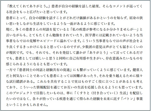 この「くすりと生活」では、患者さんの生活に目を向け、制約なく話せる環境を作り、患者の声を広く届ける機会を創出していきたいのです。