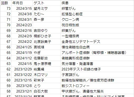 ※ゲスト名と疾患名の一覧であり、実際の動画は見られません(協賛企業・協賛個人のみが閲覧可能)