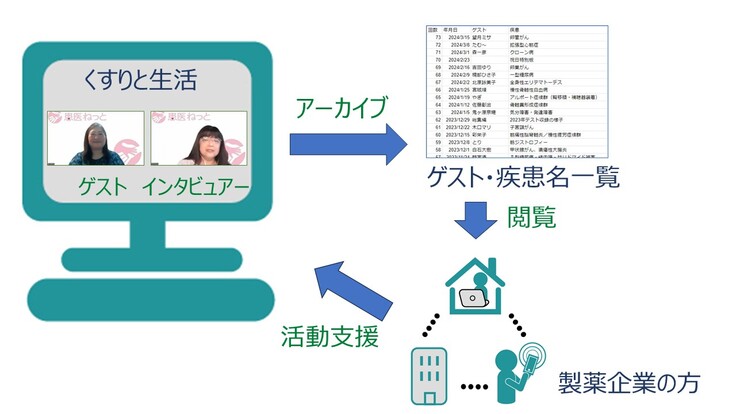 2022年にweb配信「くすりと生活」をスタートさせました。本事業では、インタビュアーが、病気のこと、治療のこと、家庭・家族のこと、生活のこと…を、日々くすりを飲んでいる患者さん(ゲスト)から聴かせていただきき、その様子を収録、編集の上、動画配信しているものです。