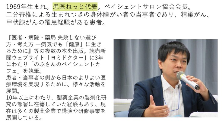 患医ねっとは、自身が身体障がい者であり、がんの罹患経験のある代表鈴木信行が2011年に立ち上げた団体です。病気がある立場の方、医療者、そして製薬企業をつなげ、「日本のよりよい医療環境を実現させていきたい」という想いから、講演、研修、イベントなど、幅広く活動しています。