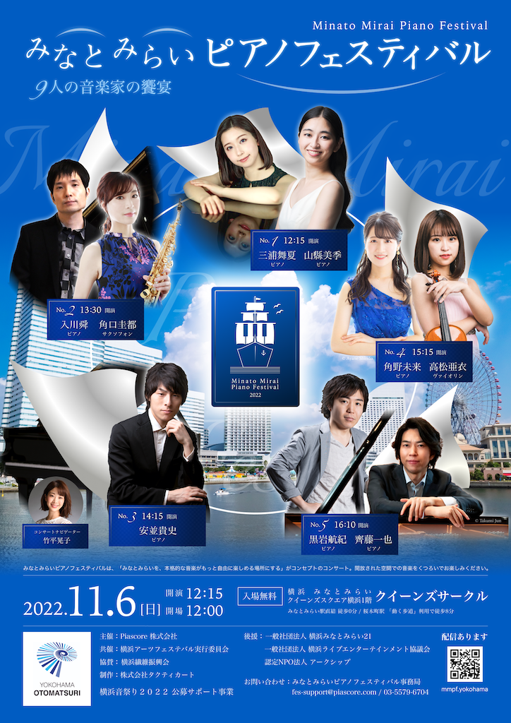 後援:一般社団法人 横浜みなとみらい21、一般社団法人 横浜ライブエンターテインメント協議会、認定NPO法人 アークシップ、一般社団法人 全日本ピアノ指導者協会(ピティナ)