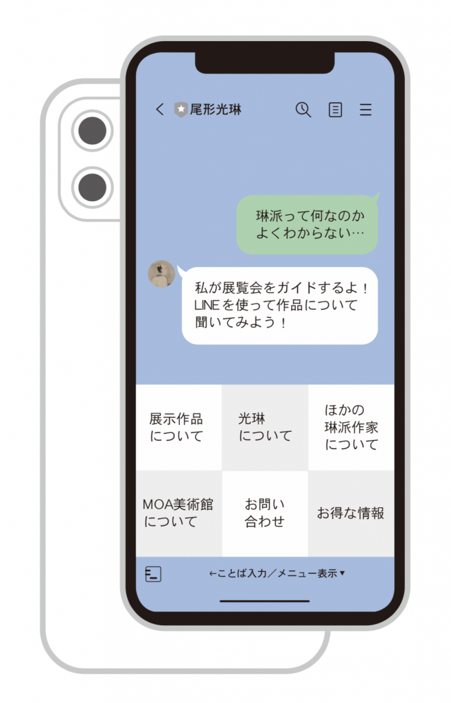 LINE を使って琳派の作家や作品について質問をすると、Kōrin が答えてくれます。まるで光琳と話しているような感覚で、琳派に関する情報を得ることができます。