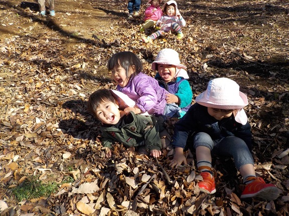 私たちは「森のようちえん」という、園庭を持たず、周辺の自然の中で活動することを大切にした保育を行います。森では秋にふかふかの落ち葉が積り、それが豊かな土壌となって、春に様々な芽が芽吹き、花が咲き、夏には水を保ち、また秋に葉が落ちる。この森の循環のおかげで私たちも活動できると実感しています。