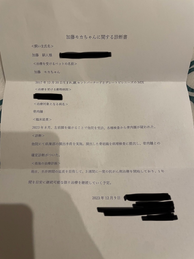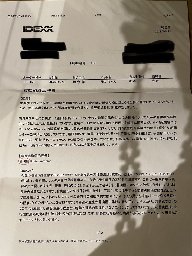 「骨肉腫の場合、モカちゃんのサイズではうちでの治療は難しいので違う病院を紹介します。違う事を願ってます、、」