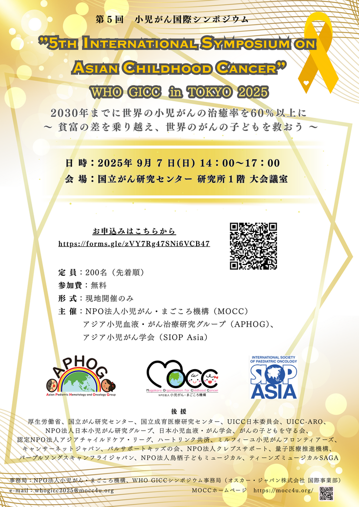 NPO法人小児がん・まごころ機構が9月7日に国立がん研究センターでおこなうイベント「”5th International Symposium on Asian Childhood Cancer””WHO GICC in Tokyo 2025"」の運営資金