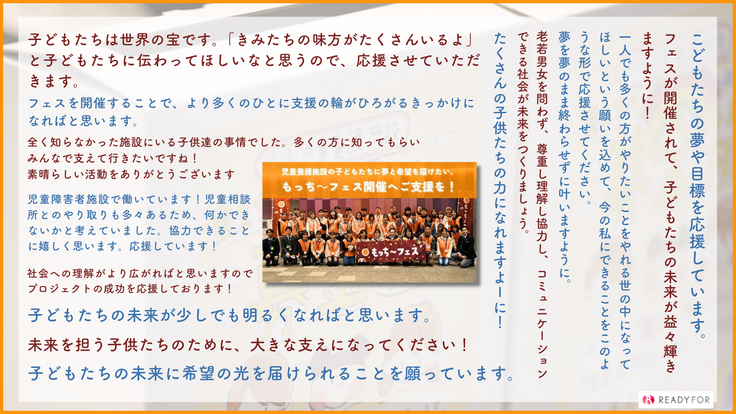 だからこそ、もっち~フェスを開催するために目標金額を達成し、子どもたちが希望を持てる社会を作っていくことを今後も目指していきます。再度のお願いとなりますが、どうか本プロジェクトや当財団の取り組みのことを、SNSなど身近な方々へご拡散いただけますと幸いでございます。