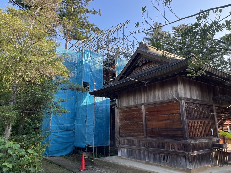 現在、本殿の周りに足場が組まれ、これから正遷座祭に向け本殿屋根修復の工事を行います。