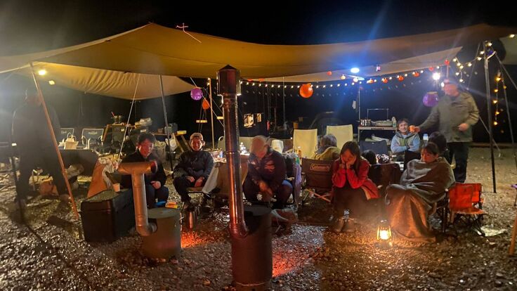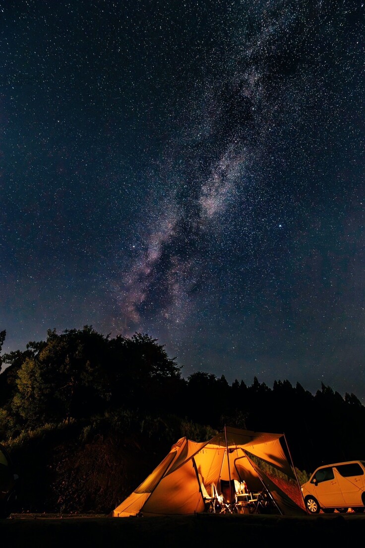 星空観賞会。天文協会で活動している専門家にガイドしてもらいます。星空の説明を聞きながら焚き火を囲んで、人気カフェ「川のhotori用瀬」のデリを楽しんでいただける、贅沢プラン。