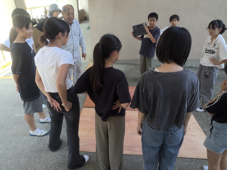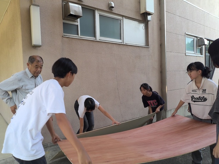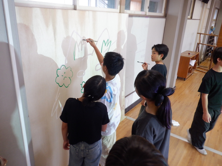 花火大会の準備も少しづつ進めています。枠仕掛け花火の下書きをしました。相模煙火店さんからベニヤ板をいただき、もえぎ台小学校のマスコットキャラクター『もえにゃん』とテーマ『つなぐ』の文字をプロジェクターで写し、絵の具を使って仕上げました。
