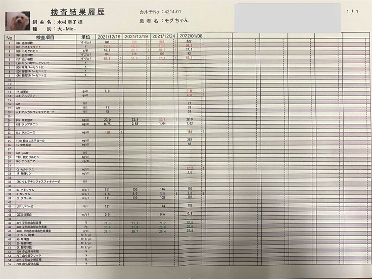 ※検査結果に数値が赤い部分がございますが、こちらは投薬治療等による副作用であり、その数値も許容範囲との事です。