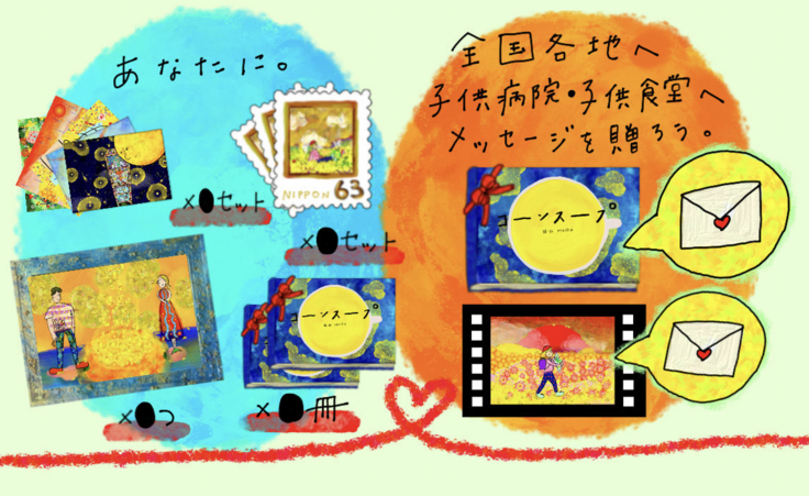お届けする絵本コーンスープは手縫いの限定絵本です!あなたへ1冊(MOiKAからメッセージ付き)、こちらから贈ります。今回の絵本「コーンスープ」でかかる費用を支援金を資本に、絵本を製造生産し、寄贈させていただきます。全国各地の子供病院子ども食堂へメッセージを届けませんか?子どもたち宛に贈っていただいたメッセージを絵本裏表紙に1つ1つ手描きで描かせていただきます。たくさんの人に届きますように。ありがとうの気持ちを込めて。