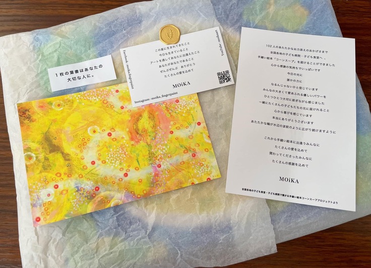 お礼の葉書をメッセージを添えてこちらから贈ります。支援金を資本に、絵本を製造生産し、寄贈させていただきます。たくさんの人に届きますように。ありがとうの気持ちを込めて。