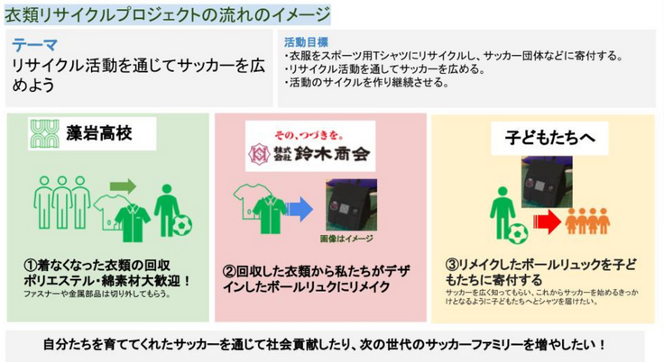 現3年生が「自分たちがお世話になったサッカーとリサイクルを掛け合わせて何かできないかと考えています」と発案、そこから始まったプロジェクトです。