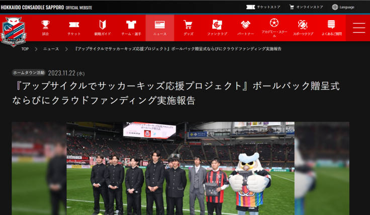 コンサドーレ札幌の公式ホームページにて、先日の贈呈式の報告と、本プロジェクトにご協力いただきました支援者の皆様のお名前が掲載されています。