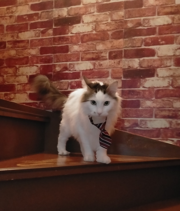 先程モカに、お土産の猫ネクタイをつけてあげたのですが、嫌がって逃げまくったので、即とりました😅