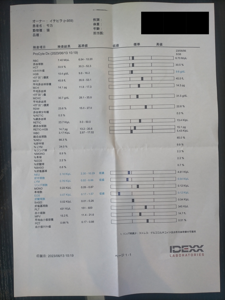 いつものように白血球もガクッと下がっており、モカにとっては打つメリットよりもデメリットのほうが高そうなので、これも打たない方向でメニューを変えていきましょう!という話になりました🥺