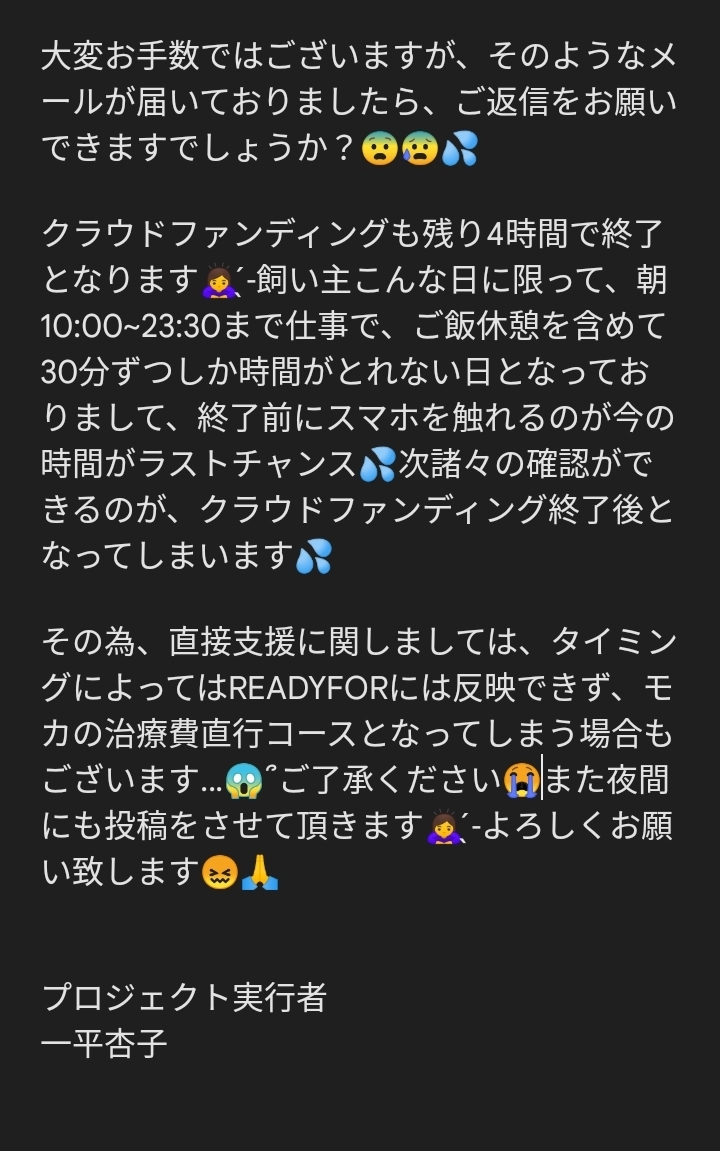 ※頂いた支援金は全て治療費に当てさせて頂きますので、費用のかからないリターンとなること、お許しください。