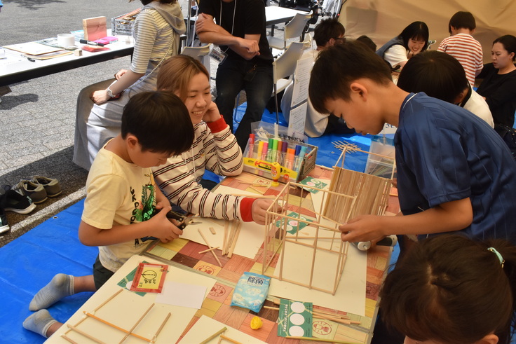 私たち木育研究所もワークショップのブースを出展し、JUON NETWORKさんから頂いた「不良品割り箸」を使った自由工作「不良品わりばし変身大作戦!」を行いました😊