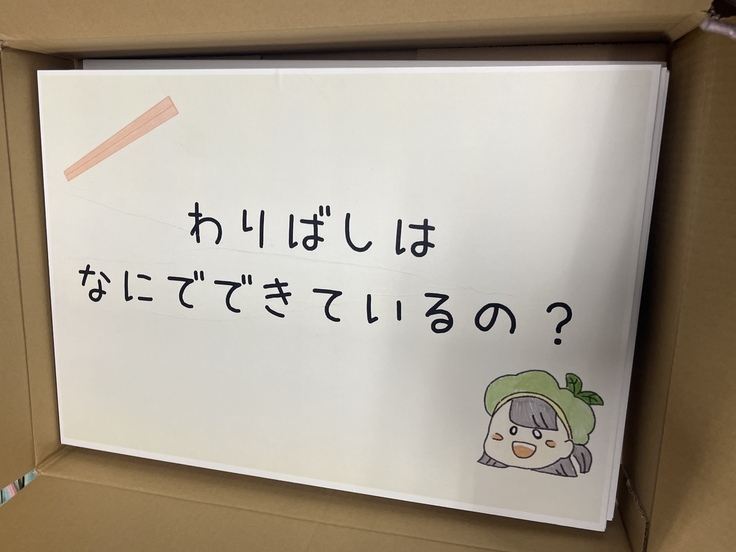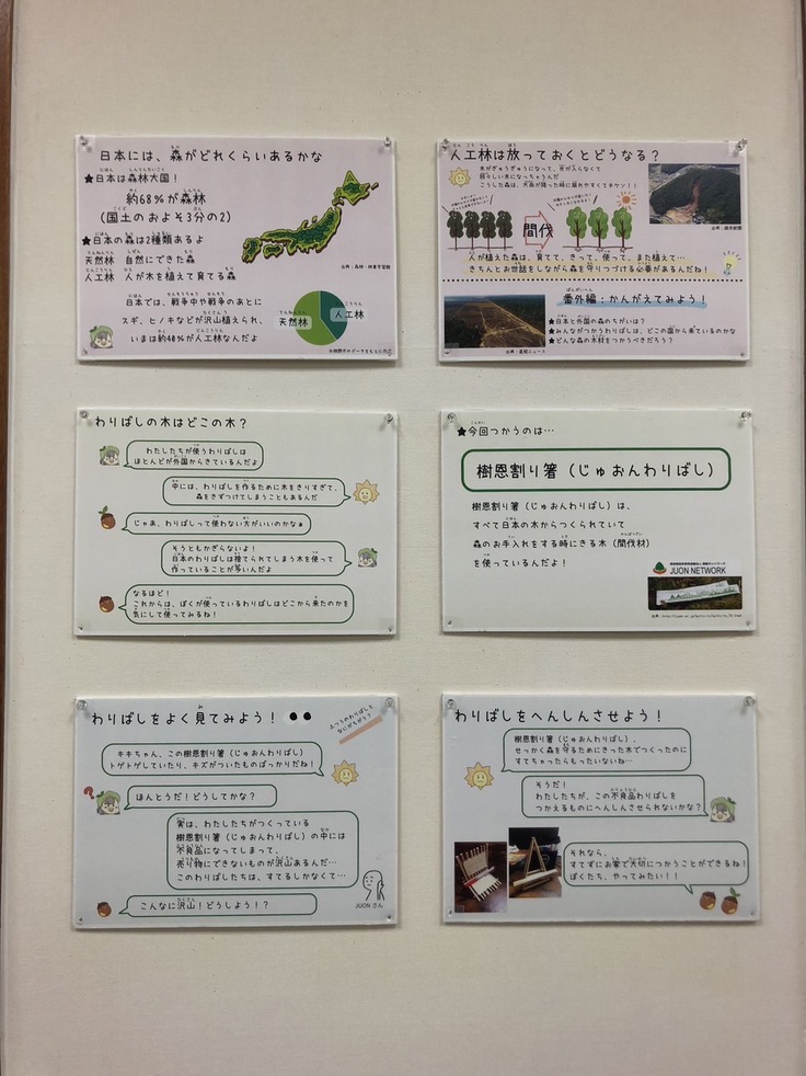 また、私たちのワークショップでは、掲示物やワークシートの作成も行っています。今回は「わりばしは何でできているの?」「どうして木をきるの?」「どうして変身させるの?」という3つの問いを立て、子どもたちに考えてもらうスタンプカードを作成しました!