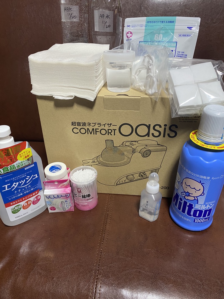 ネブライザー(薬を噴霧する機械)を朝晩で2×2回づつ(薬が2種のため) それの消毒用にミルトン。