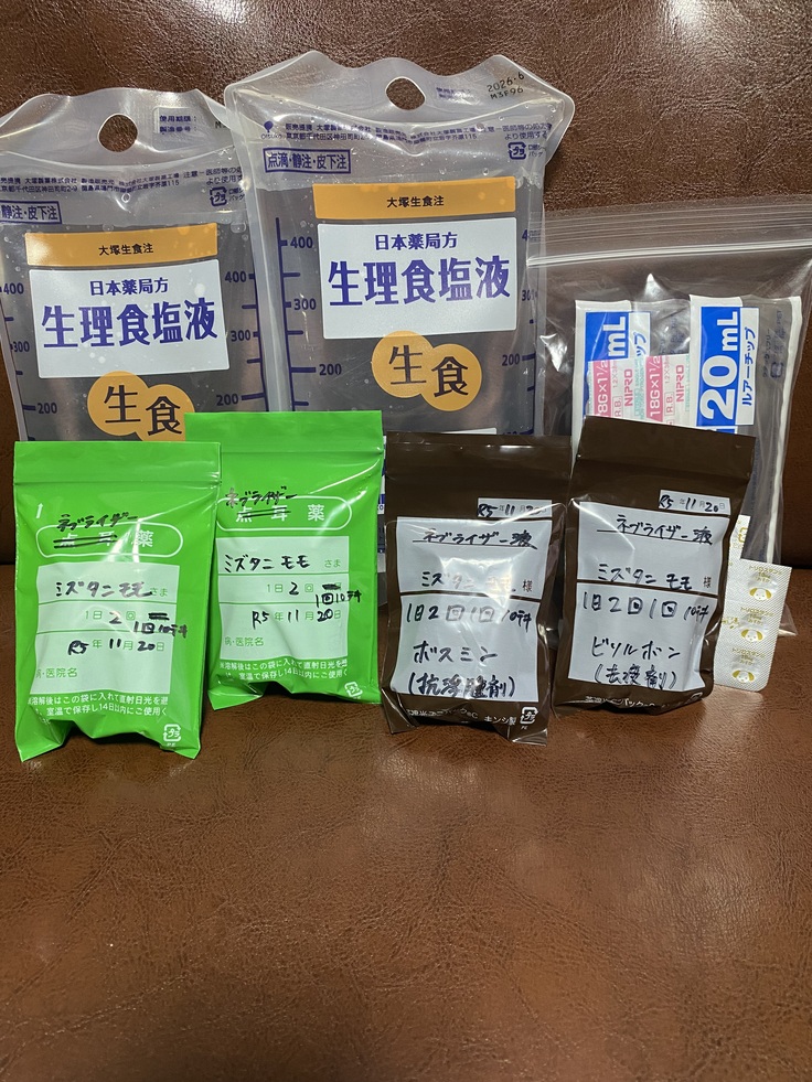 緑と茶色のがネブライザー用のお薬です。生理食塩水は気化させる時に使います。ももの場合緑と茶色が同時に使えないため、別々に行います。