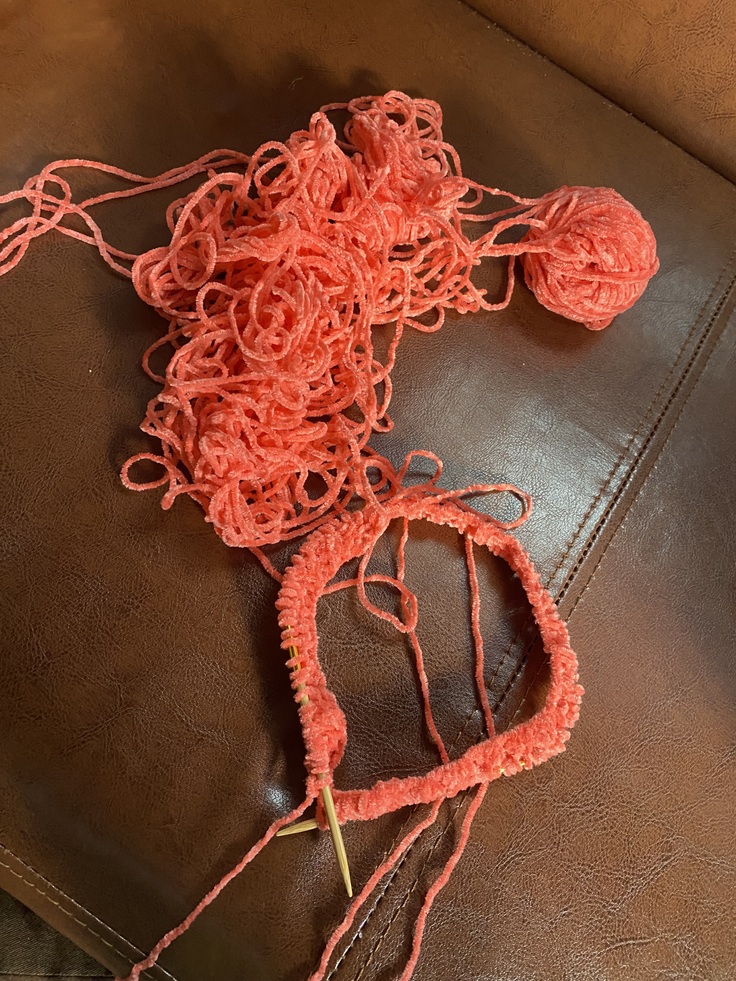 やり始めたら楽しそうに毛糸玉で遊ばれて、もつれてしまいました。編むよりほどくほうが時間かかりました🤣