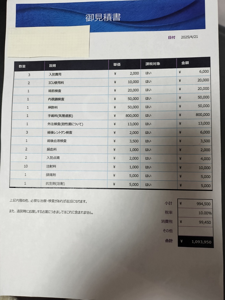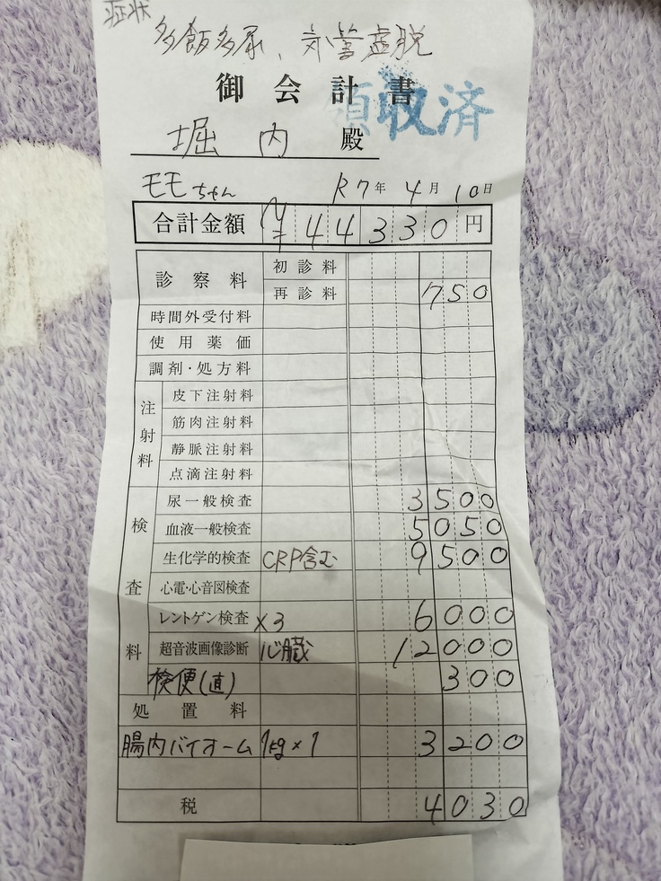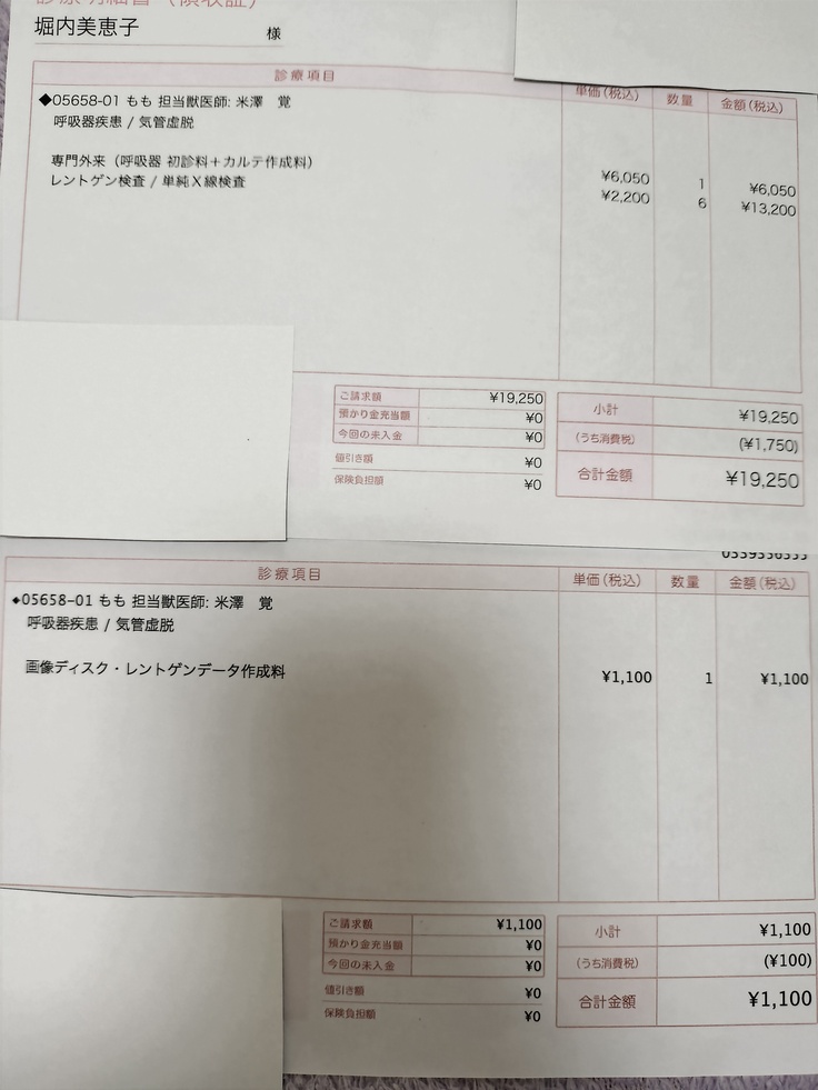 その時に説明を受けた獣医師さんが書いてくださった 説明文と支払い明細書です。