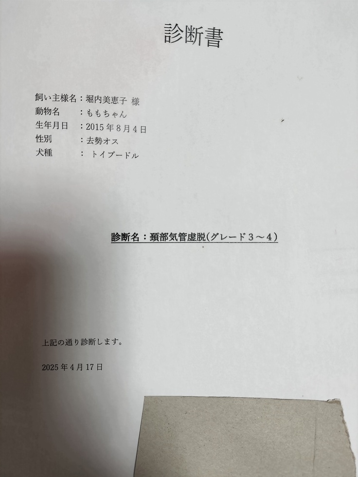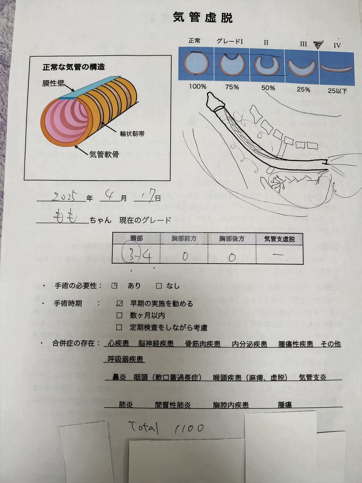 ももの 今の状態の気管虚脱の状態の説明書です。