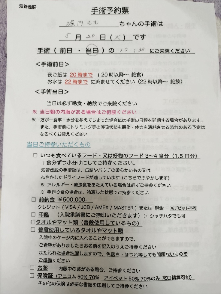 特に気管虚脱はかなり重度だということで病院ではステージⅢと判断されました。手術を勧めますと言われましたがここではできないので紹介しますと言われ気管虚脱専門の病院を紹介していただきました。