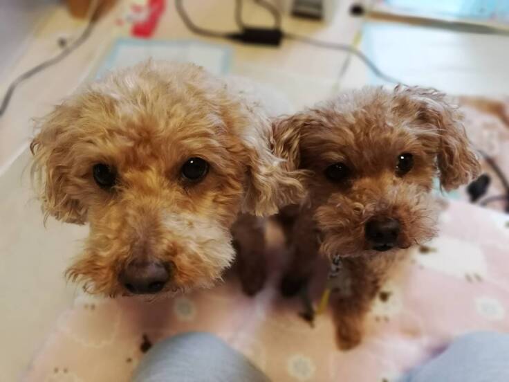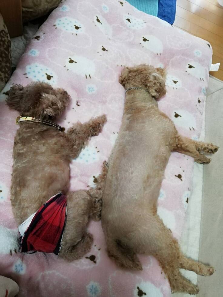 ももの方が体は倍ぐらいあるけれど もう1匹のトイプードル「 ここりん」とは本当に仲良しです。いつもここりんに怒られそれでもくっついていつもどこに行くにも一緒です。本当に2匹とも可愛いです。