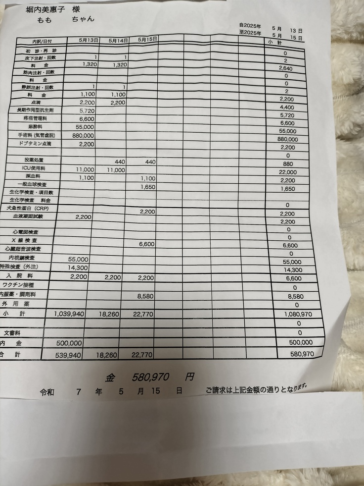 ご支援いただいた支援金は全て「もも」の手術に関する費用に当てさせていただきたいと思っております。