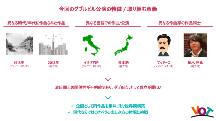 両演目の魅力を損なわずに作り上げるのは非常に難しいことですが、私たちが目指すオペラ文化の発展を実現する上で欠かせない"観やすさ”と”楽しさ”を生み出せると確信し、企画立案に至りました。