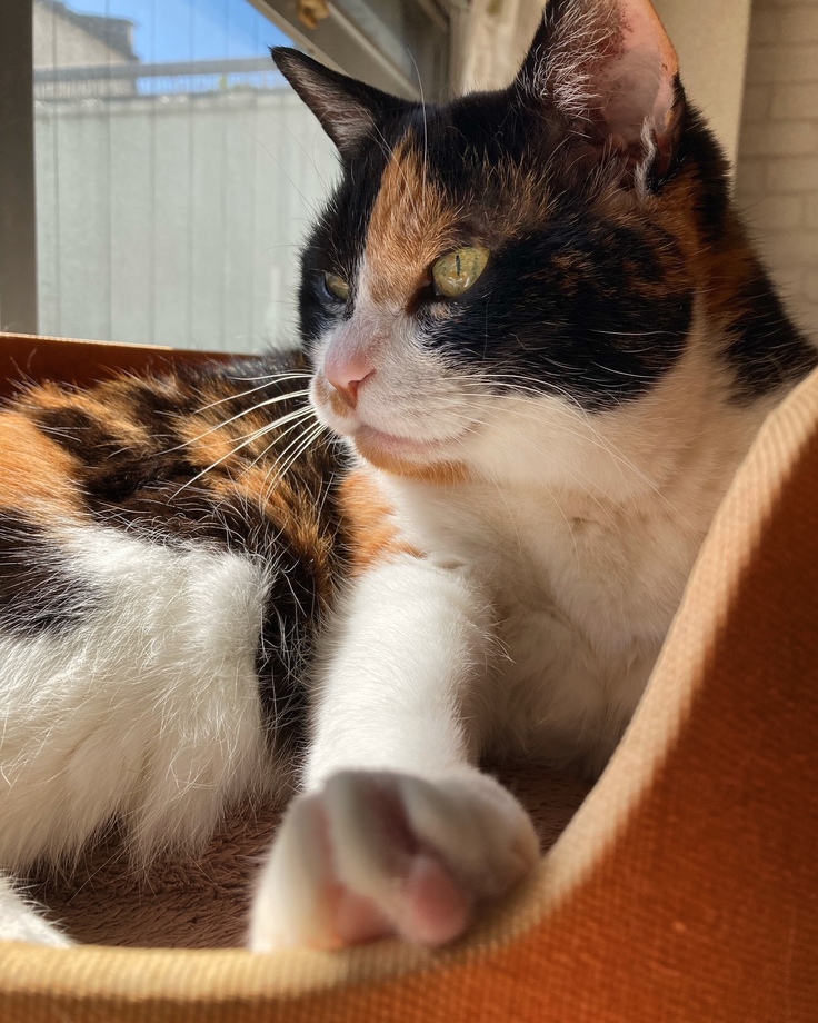 このオレンジ色のキャットタワーはだいぶ古びてボロボロなので新しいタワーも置いているのですが、