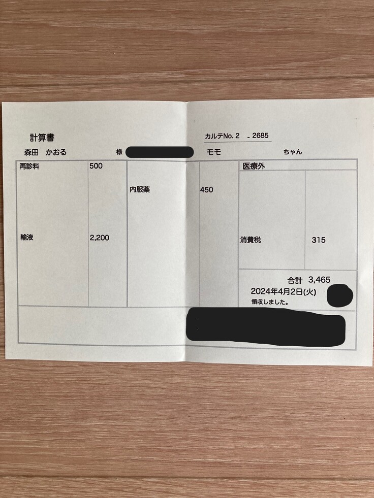 今回は家に常備している吐き気止めの薬代もはいっています。