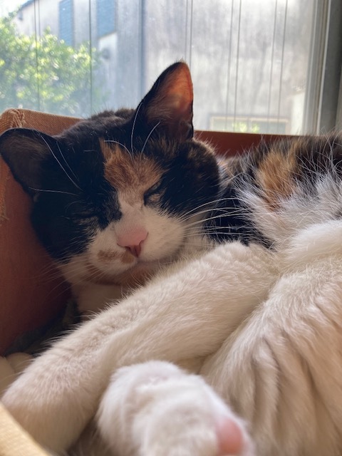 キャットタワーで寝ているところを撮影しようとしたら、起こしてしまいました😅
