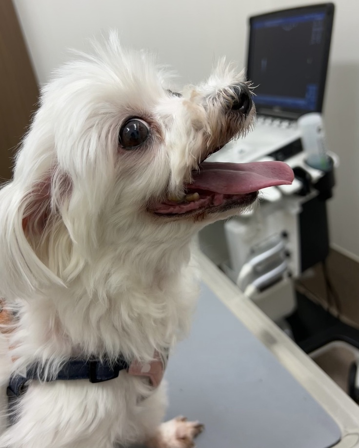 診察台でのももこです。おろしてーと言わんばかりの顔をしています。エコーやレントゲンの時は大人しく、動かずにいてくれるので検査がしやすいと、以前のかかりつけ医の先生から言われてことがあります。お利口さんだそうです☺️自慢話をしてしまいすいません😅