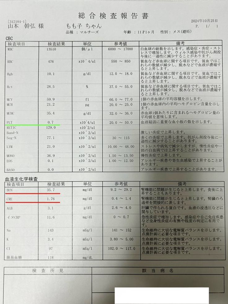 あとはPLTやWBCは相変わらず悪い方向に向いてますが、まずは腎臓が落ち着いてきたことで安心しています。