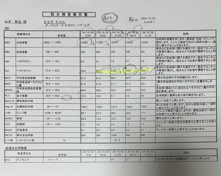 胃腸からの出血が多く、貧血で赤血球(Hct)が15%の為、輸血の承諾をして欲しいとのことでした。